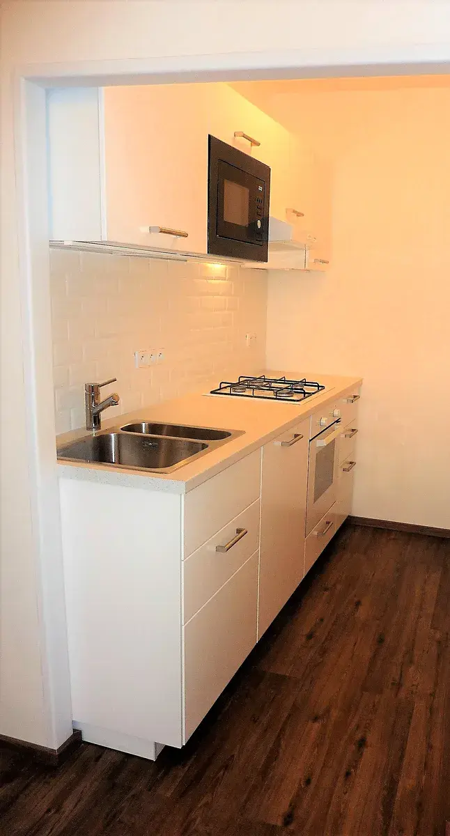 Zařízení v bytě: kuchyňská linka, plynový sporák, elektrická trouba, digestoř, mikrovlnná trouba, lednice s mrazničkou a myčka nádobí.