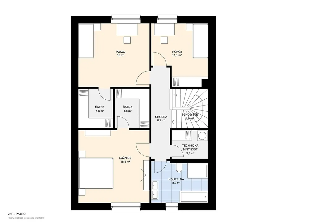 V 1. patře jsou umístěny tři pokoje, dvě šatny, koupelna s WC a další technická místnost.