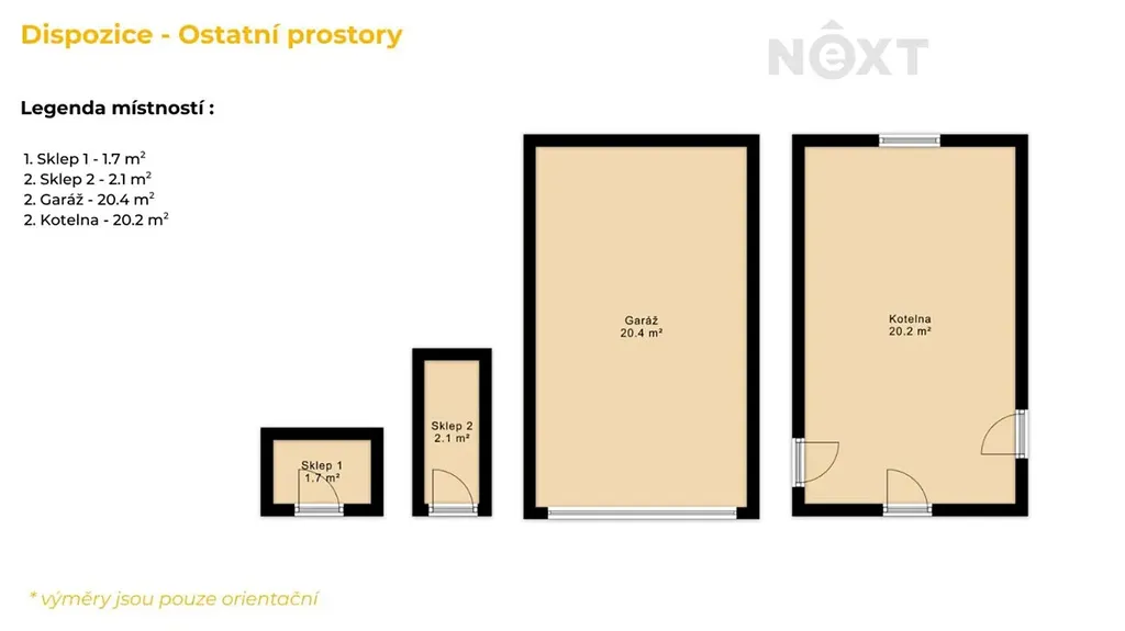 K bytu náleží dvě sklepní kóje o velikosti 1,7 m2 a 2,1 m2, které poskytují praktický úložný prostor, a velkou přidanou hodnotou je vlastní garáž přímo v domě o velikosti cca 20 m².