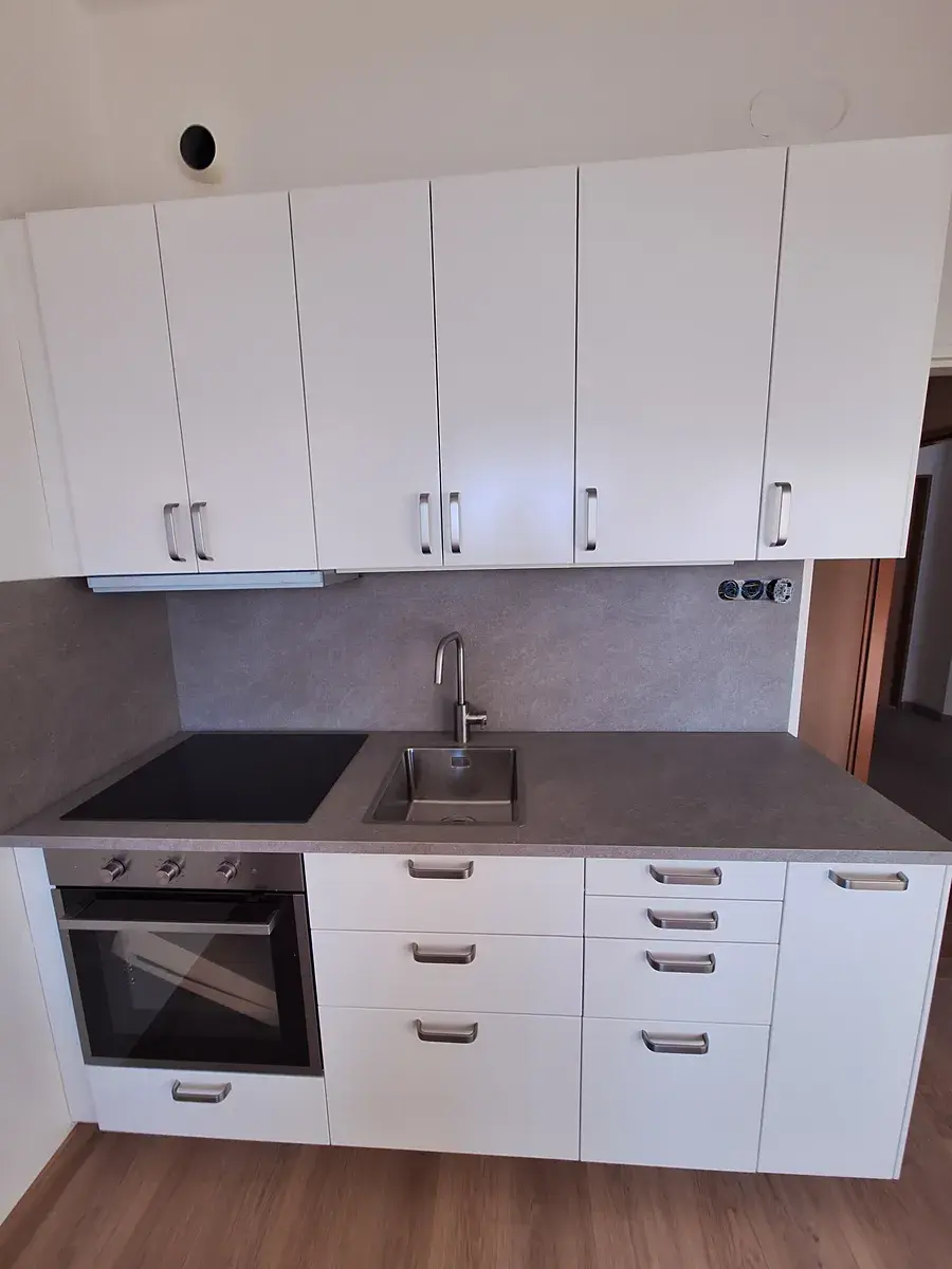 V pokoji nová kuchyňská linka s varnou deskou, lednice.