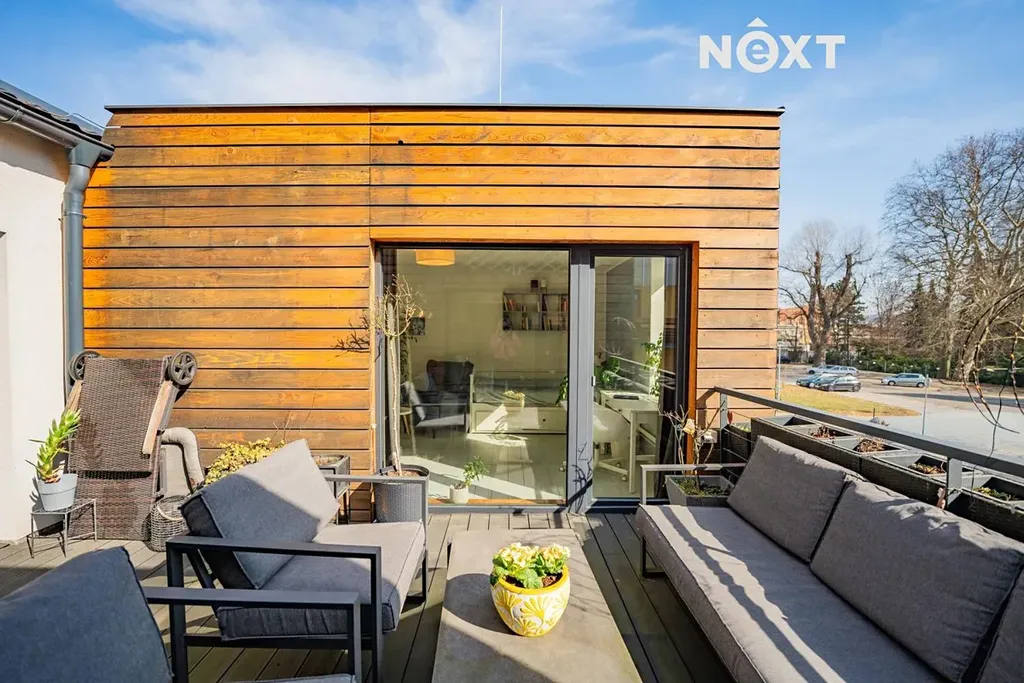 Velkou přidanou hodnotou bytu jsou dvě prostorné terasy, které dodávají bydlení jedinečný charakter. U vstupu do bytu se nachází terasa o velikosti 42 m², která vytváří příjemný a reprezentativní vstup do domova a umocňuje pocit bydlení v rodinném domě. Druhá terasa o velikosti 15,5 m² je přístupná ze tří místností a nabízí dostatek soukromí – ideální místo pro ranní kávu, večerní sklenku vína nebo klidný odpočinek.