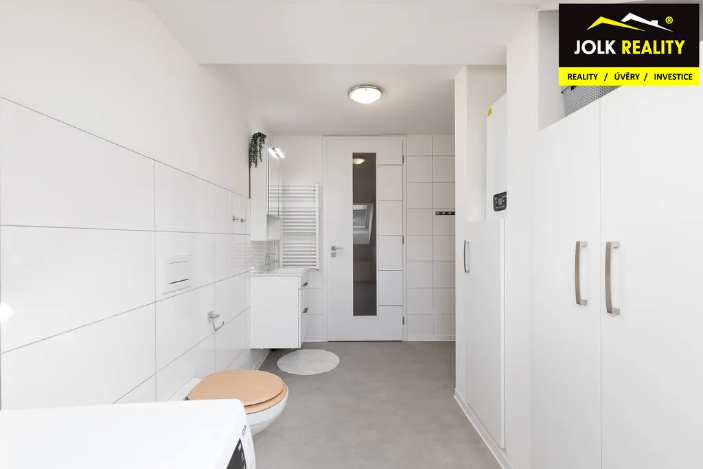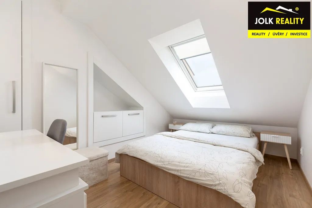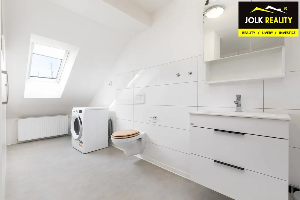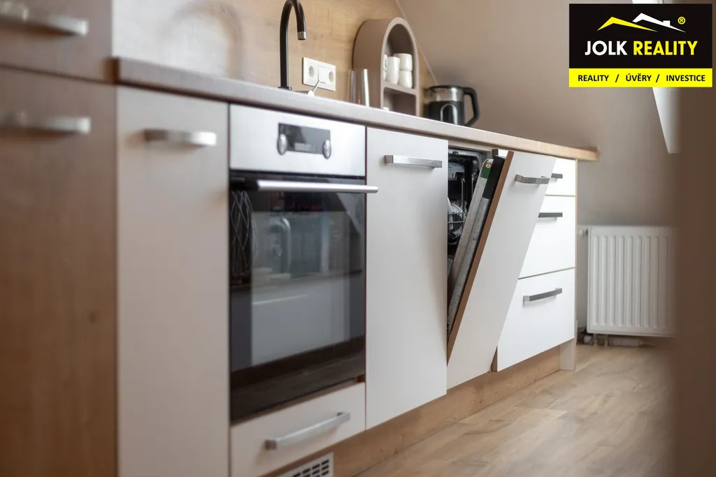 Atraktivní vestavba s kuchyňskou linkou a vestavěnými skříněmi na míru jde ruku v ruce s elegantním a kvalitním technickým zázemím. Mám na mysli plynový kondenzační kotel BAXI + saulus termostat, klimatizační jednotku Sinclair, střešní okna Velux s trojsklem + zatemňovací roletky, laminátovou podlahu Quick step a dveře s obložkami firmy Zlomek, za vestavěné spotřebiče lednička s odděleným mrazákem Bosch, myčka Elektrolux, granitový dřez a digestoř s odtahem.