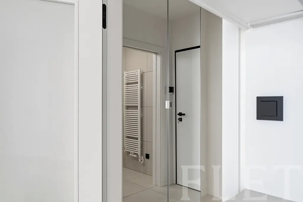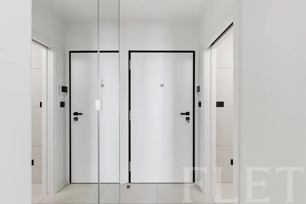 Interiér nabízí efektivně využitý prostor s obývací částí a plně vybaveným kuchyňským koutem. Ten disponuje vestavnými spotřebiči – indukční varnou deskou, troubou, digestoří s odtahem, myčkou, mikrovlnnou troubou i lednicí s mrazákem, nechybí ani vestavná pračka. V koupelně je sprchový kout, toaleta a elektrické odvětrávání. Praktická předsíň se skříní poskytuje dostatek úložného prostoru. Velkým benefitem je také balkon o velikosti 3 m², ideální pro ranní kávu či večerní relax.