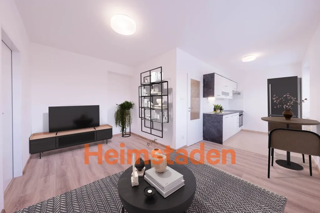 Interiér bytu prošel kompletní rekonstrukcí s důrazem na detail, kvalitu a současné trendy bydlení. Dominantou je vzdušný obytný prostor s elegantní plovoucí podlahou v dekoru dřeva, která dodává interiéru teplo a nadčasový vzhled. Kuchyňská část a vstupní hala jsou doplněny světlou dlažbou, která podtrhuje čistý a moderní styl.