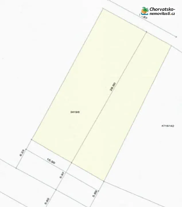 Pozemek má pravidelný obdélníkový tvar o přibližných rozměrech 16 × 29 metrů, což umožňuje pohodlné plánování výstavby.