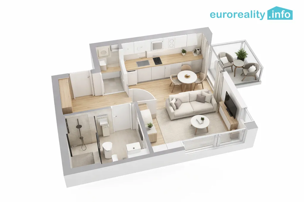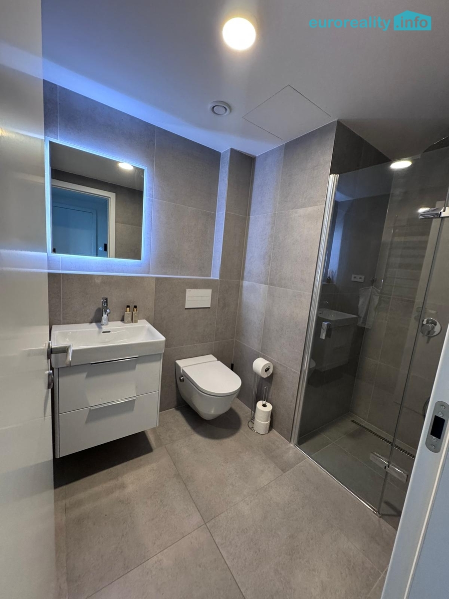 Unikátní nabídka nového bytu, jehož interiér má výměru 26,6 m2 a tvoří obývací pokoj o výměře 17,4 m2 s plně vybavenou kuchyní (zcela nová kuchyňská linka s el. deskou, odpadkový koš), jídelním prostorem a přístupem na balkon 3,60 m2 s lukrativním výhledem na Vyšehrad, koupelna se sprchovým koutem a chytrou toaletou a vstupní chodba včetně komory s regálem.