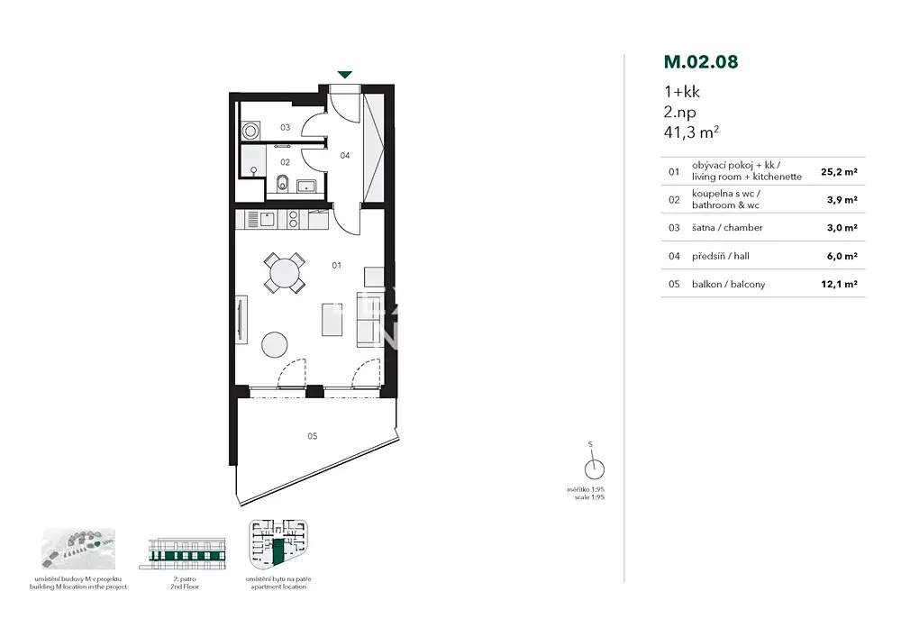 Byt nabízí k užívání vstupní chodbu, obývací pokoj s kuchyňským koutem, koupelnu, komoru a balkon (12,1 m²). K dispozici je sklep (2,7 m²) a garážové parkovací stání.