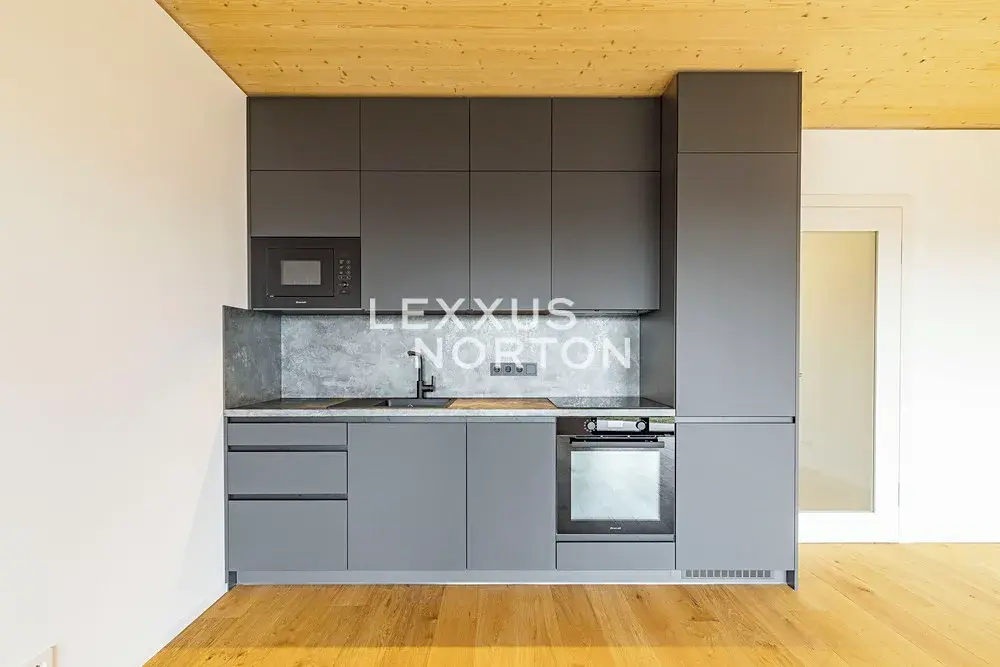 Kuchyňský kout je vybavený indukční varnou deskou, troubou, lednicí s mrazákem, mikrovlnnou troubou a myčkou nádobí. Vstupní chodba disponuje vestavěnou skříní. Byt dále disponuje moderním smart home systémem Loxone, který umožňuje mimo jiné inteligentní ovládání venkovních žaluzií, regulaci podlahového vytápění a chlazení v každé místnosti či monitorování spotřeby vody a energie.