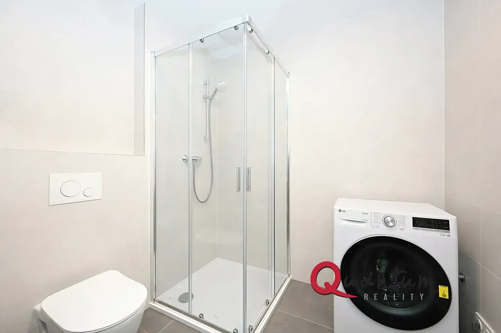 V koupelně se nachází sprchový kout, toaleta a kombinovaná pračka se sušičkou. Chodba je dostatečně prostorná a nabízí praktické zázemí.