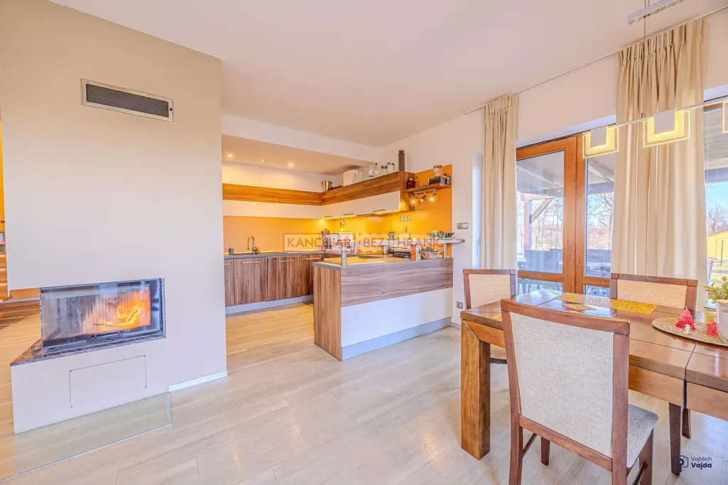 Dominantou domu je světlý obytný prostor s jídelnou, ze které je přímý vstup na terasu a do stylové dřevěné pergoly s posezením, ideální pro relaxaci, rodinné večeře i setkání s přáteli.