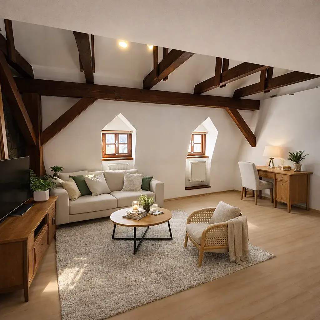 Byt zaujme především svým otevřeným prostorem s přiznanými dřevěnými trámy, které dodávají interiéru jedinečný charakter a útulnou atmosféru. Dominantou je prostorný obývací pokoj s kuchyňským koutem a galerií, kterou lze využít jako ložnici či pracovní zónu.