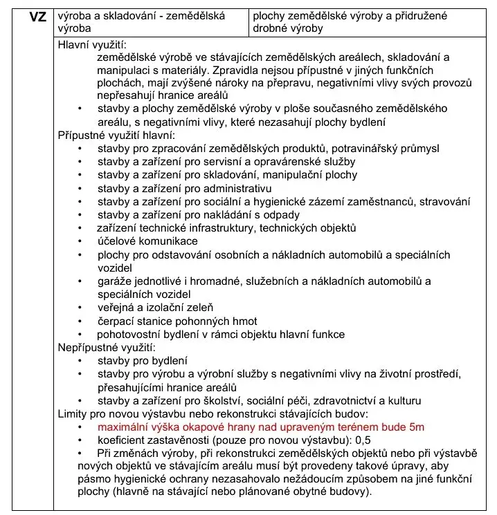 Dvě parcely o výměře 2.726 m² jsou v katastru nemovitostí vedeny jako "ostatní plocha - manipulační plocha" a mají přímý přístup z obecní asfaltové komunikace. V platném územním plánu jsou vedeny jako "plochy zemědělské výroby a přidružené drobné výroby". Je na nich možné postavit například sklad, výrobní halu včetně kancelářského zázemí, zařízení pro nakládání s odpady, garáže anebo také čerpací stanici pohonných hmot. Budoucí zastavěnou plochu není nutné vyjímat ze ZPF. Nabízené pozemky jsou na kraji obce a sousedí pouze se starou zemědělskou halou na pozemku jiného vlastníka.