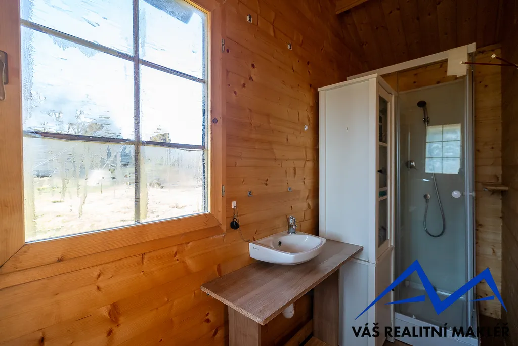 Druhá chata (12 m² ) je využívána jako sklad na nářadí. Je zde také kuchyňka s elektrickým vařičem a místo na lednici.
