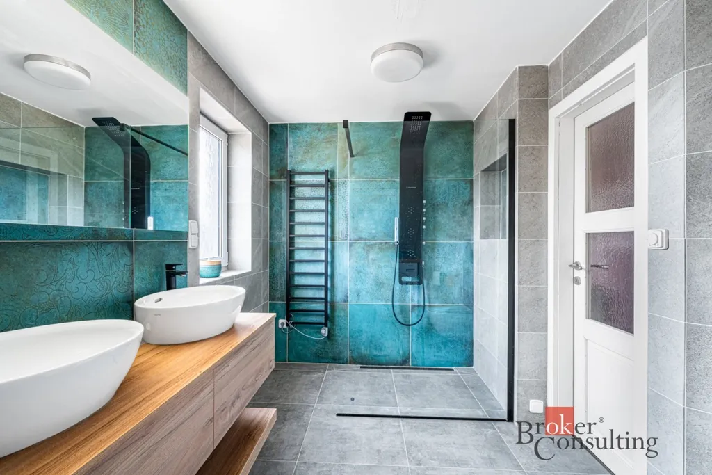 V patře je druhá koupelna, tři samostatné pokoje a sauna. Ze dvou pokojů je přímý vstup na balkón.