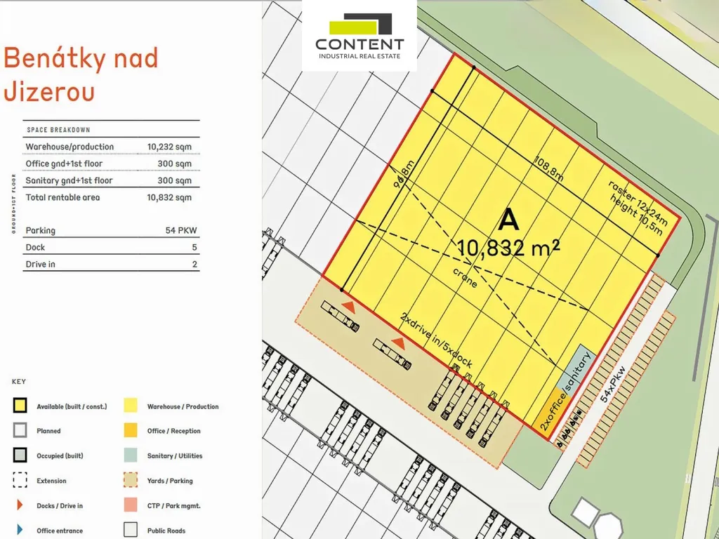 V zastoupení majitele a bez provize nabízíme novostavbu kvalitních průmyslových prostor o výměře 10232 m², umístěných v průmyslovém areálu s ostrahou v blízkosti dálnice D10 EXIT 27 s velmi dobrou dostupností do Mladé Boleslavi (Škoda Auto).