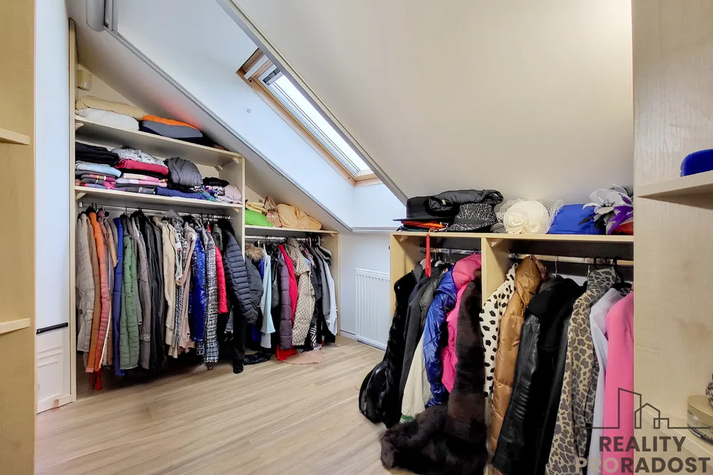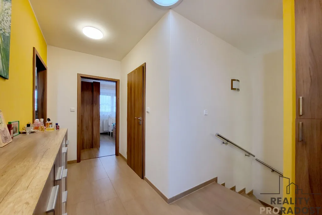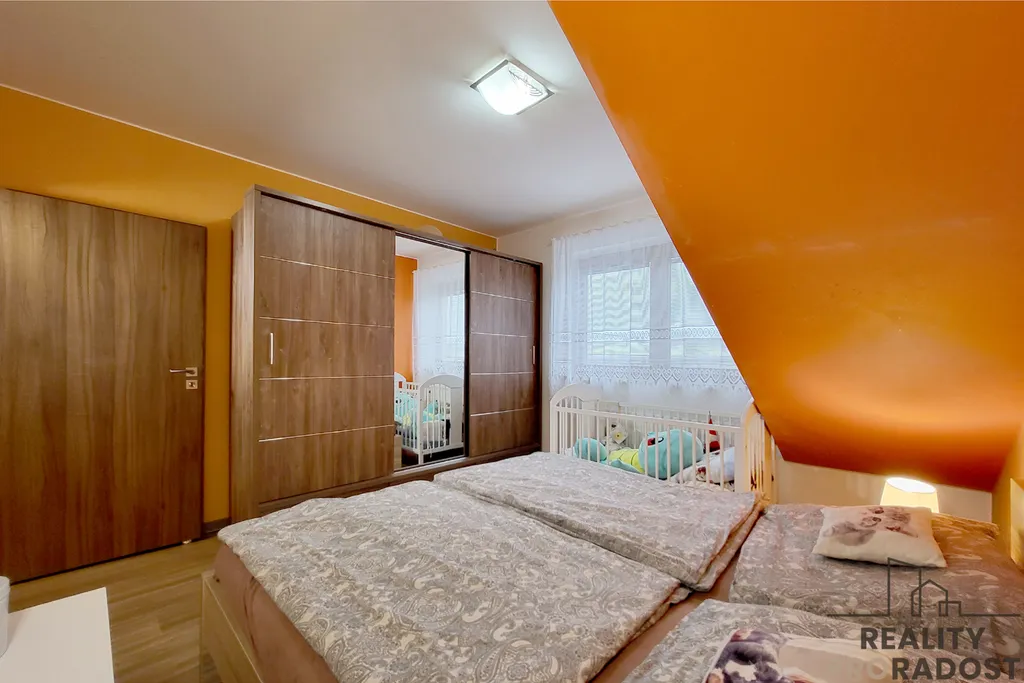 V patře se nachází klidová zóna domu – ložnice, dva samostatné pokoje (cca 12 m²) a menší pokoj (cca 6 m²), který může sloužit jako šatna, pracovna nebo dětský pokoj. K dispozici je koupelna s vanou a samostatné WC. Výhodou jsou také praktické úložné prostory.