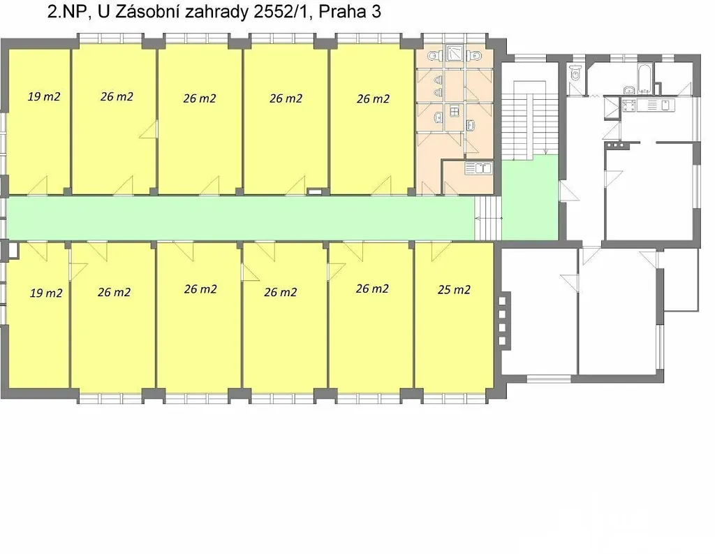 Nájemné činí 200 Kč/m2/měs. a služby jsou odhadovány na 100 Kč/m2/měs. (spotřeby měřené).