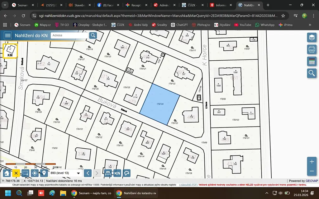 Inž. sítě: el. a plyn na hranici pozemku, voda a kanalizace jsou v přístupové komunikaci.