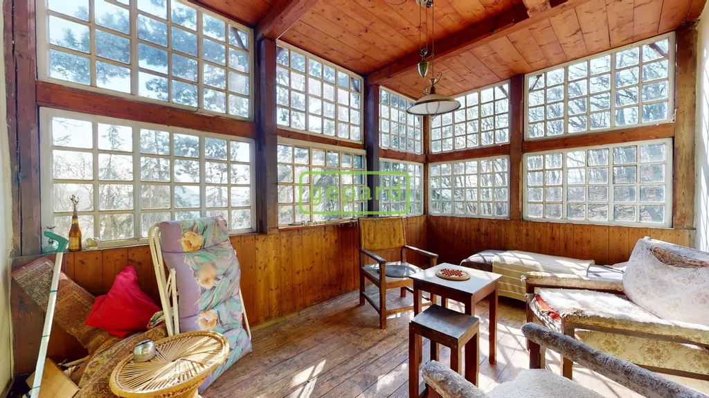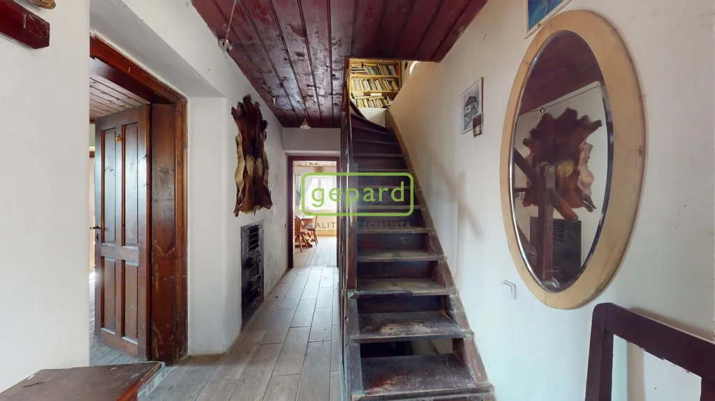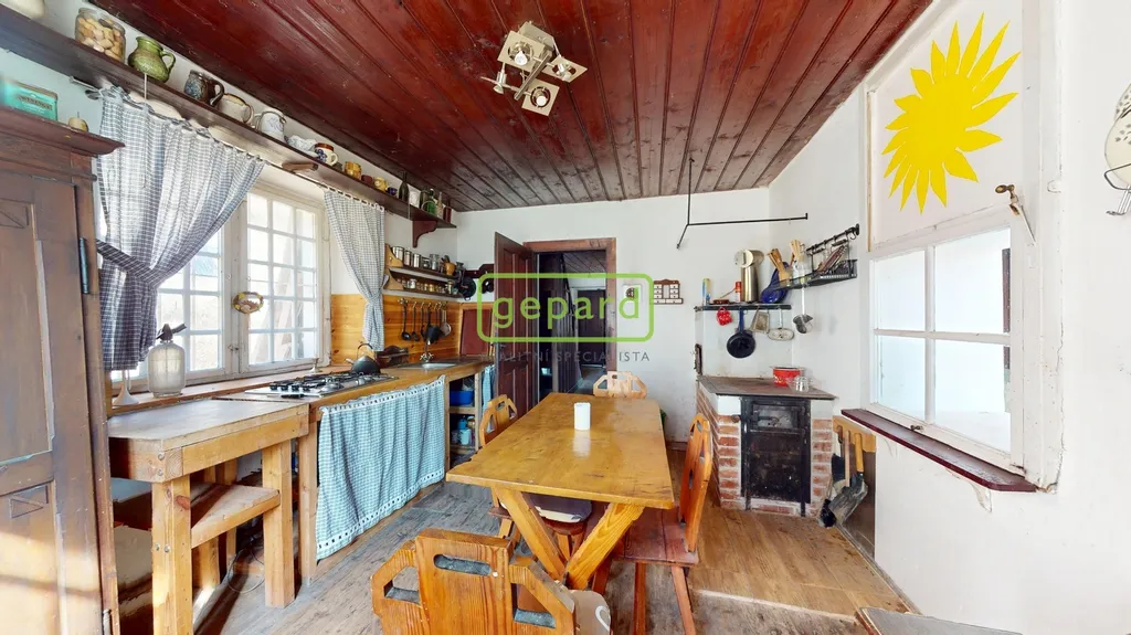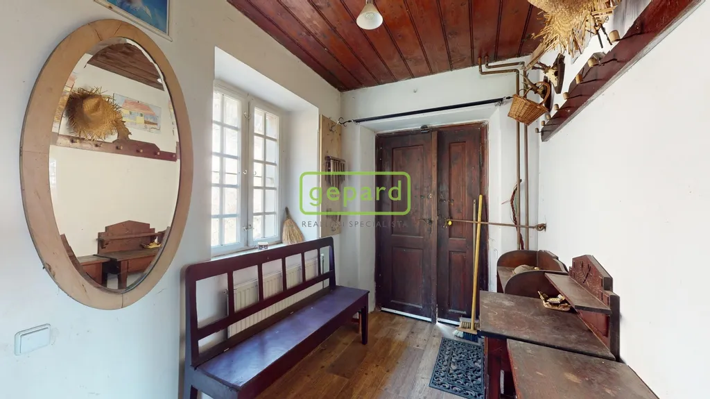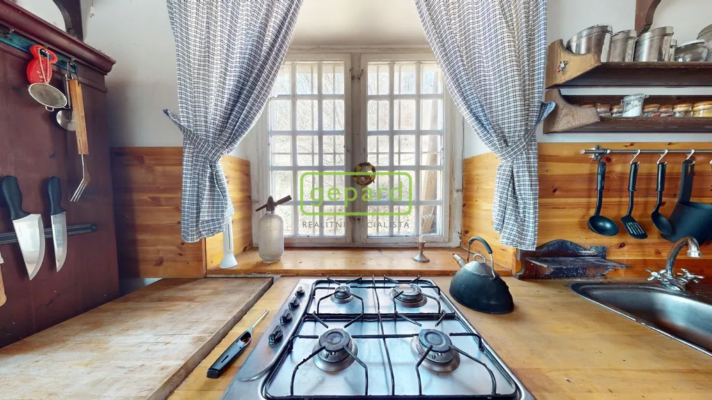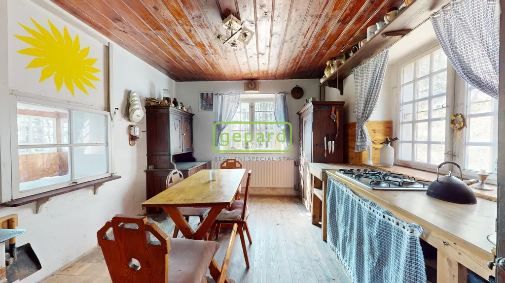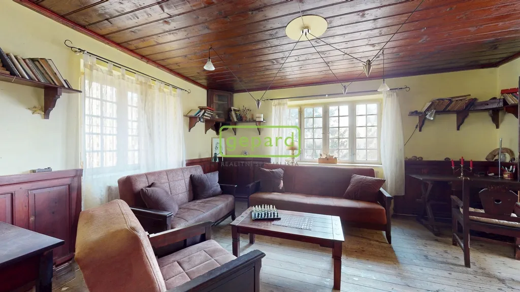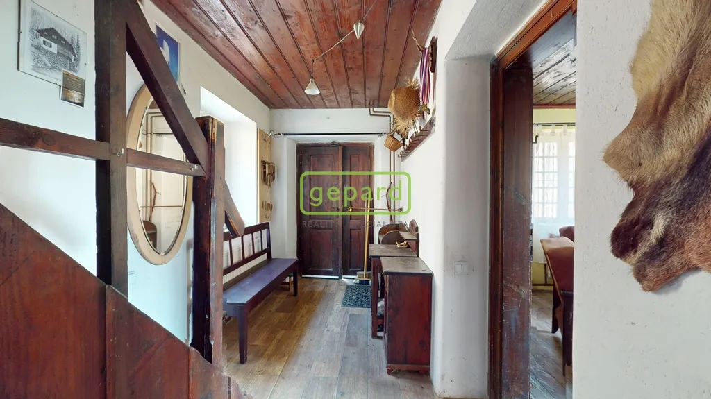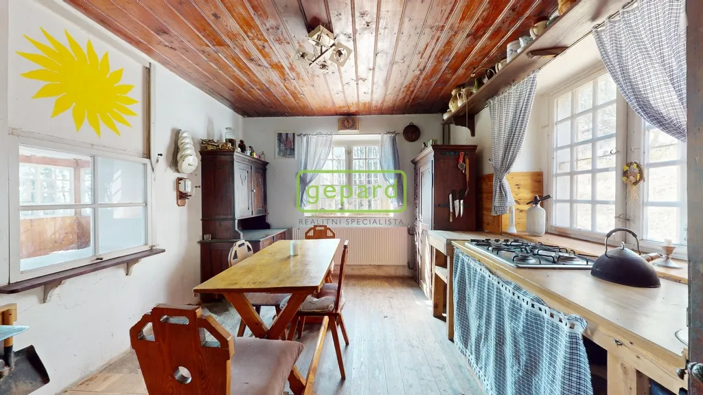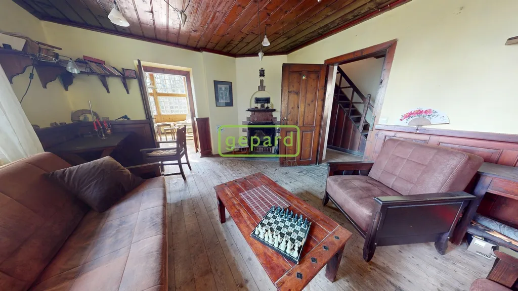 Hlavní obytné patro tvoří srdce celé nemovitosti. Najdete zde kouzelný obývací pokoj, samostatnou kuchyni, suchý záchod a nádhernou zimní zahradu, která nabízí přímý kontakt s okolní přírodou. Interiér si zachoval svůj původní charakter – dřevěné podlahy, stropy, masivní dveře i vybavení, které zůstává součástí prodeje.