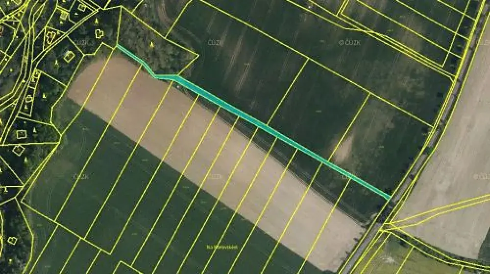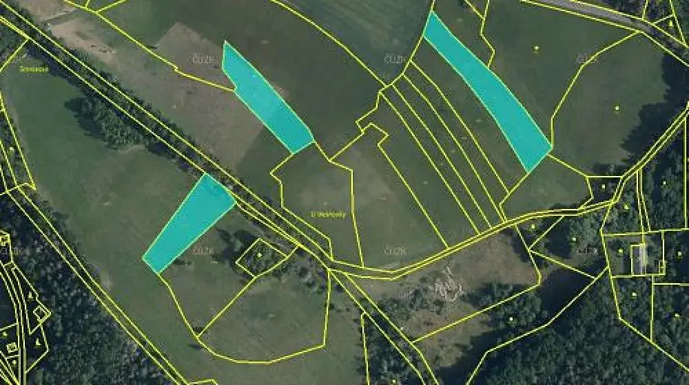 Tyto pozemky jsou zapsané na LV 73 pod parcelními čísly 442/3, 461, 478 s celkovou výměrou 6607 m2, jedná se o prodej podílu 1/4 o výměře 1651,7 m2.