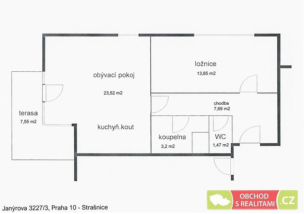 Dispoziční plánek s výměrou jednotlivých místností přikládáme. Z obývacího pokoje s jihozápadní orientací je výstup na terasu. Kuchyňská linka je vybavena pečící troubou, varnou deskou, digestoří a lednicí s mrazákem. Myčka není součástí nájmu, ale je zde prostor pro její umístění a instalaci. Koupelna je vybavena vanou, WC je samostatně. Pračka se sušičkou není součástí nájmu, oba tyto spotřebiče je možné umístit do koupelny. Ložnice má severozápadní orientaci. Byt je nabízen jako nezařízený. Podlahovou krytinou v obou pokojích je plovoucí podlaha.
