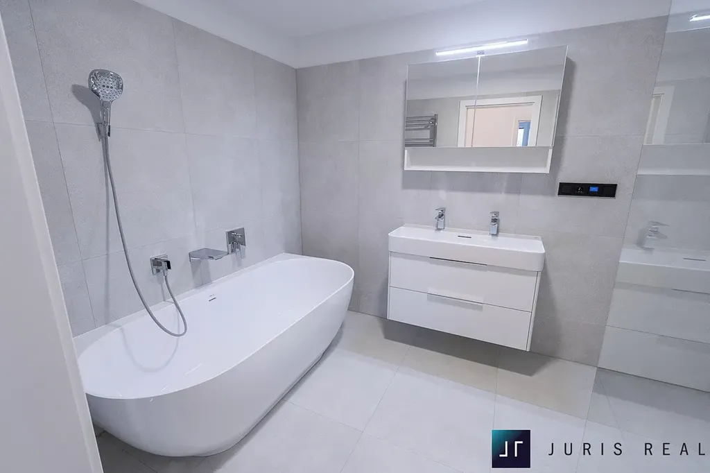 - nové zařizovací předměty v koupelně: velmi kvalitní designová vana za cca 50 000,- Kč, kvalitní a designový sprchový kout, vše se zařizovacími předměty Hans Grohe, nerezový žebřík napojený na systém plynového vytápění v bytě + el. podlahové topení v koupelně, ovládané digitálním termostatem.