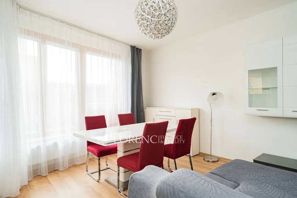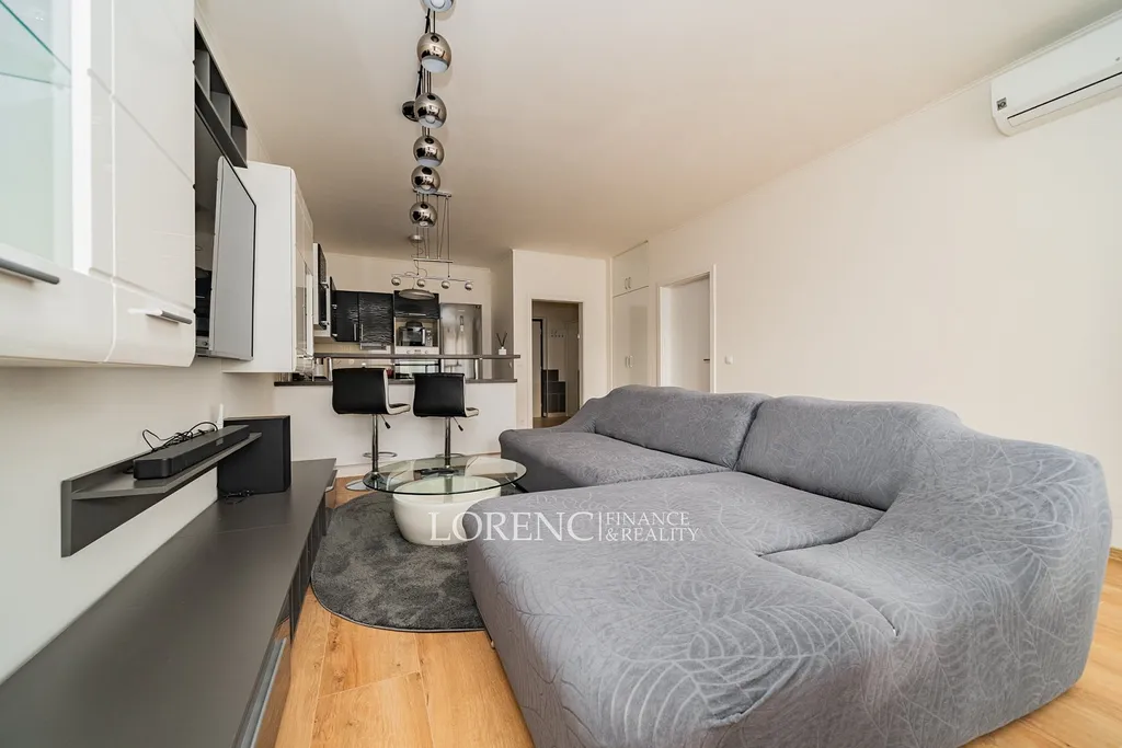 Srdcem bytu je světlý obývací pokoj s klimatizací a moderním kuchyňským koutem. Kuchyňská linka je vybavena vestavěnými spotřebiči – myčkou nádobí, troubou, sklokeramickou varnou deskou a digestoří. Z obývacího pokoje je přímý vstup na balkon, ideální pro ranní kávu nebo večerní relaxaci. Další místností je prostorná ložnice, která rovněž nabízí vstup na balkon. Z ložnice se vstupuje do koupelny s prostornou vanou. Byt je kompletně vybavený.