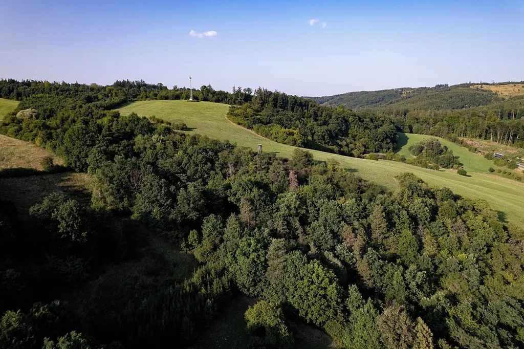 Pozemek se nachází na krásném vyvýšeném místě nad obcí s výhledem do okolní přírody.