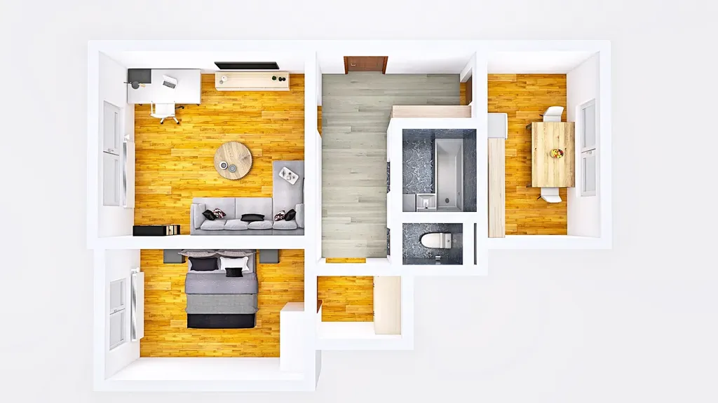 Byt se skládá z prostorné chodby, kuchyně, koupelny s vanou, samostatného WC, obývacího pokoje, průchozí šatny a ložnice. Mimo šatnu jsou všechny místnosti neprůchozí. Orientace je na západ a východ. Na podlahách je laminát, PVC a ker. dlažba v koupelně a WC. V kuchyni je k dispozici kombinovaný sporák. Vytápění a ohřev vody jsou ústřední dálkové. Součástí pronájmu je také sklepní kóje. Parkovat lze na veřejné ulici před domem.