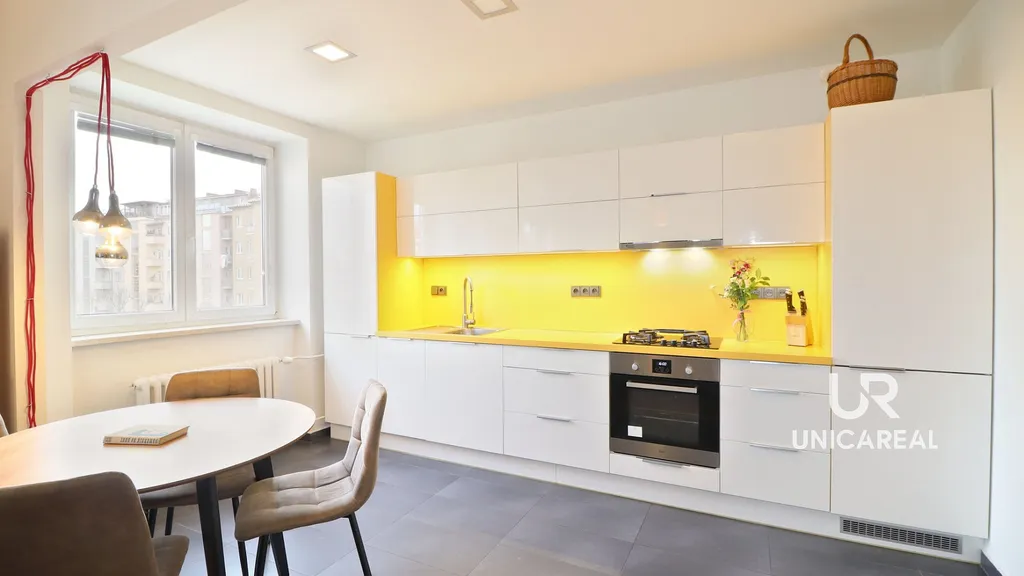 Dominantou bytu je otevřený obývací prostor propojený s kuchyňským koutem, který tvoří ideální místo pro každodenní život. Kuchyňská linka je plně vybavena vestavěnými spotřebiči ( myčka, lednice s mrazákem, trouba, mikrovlnná trouba).