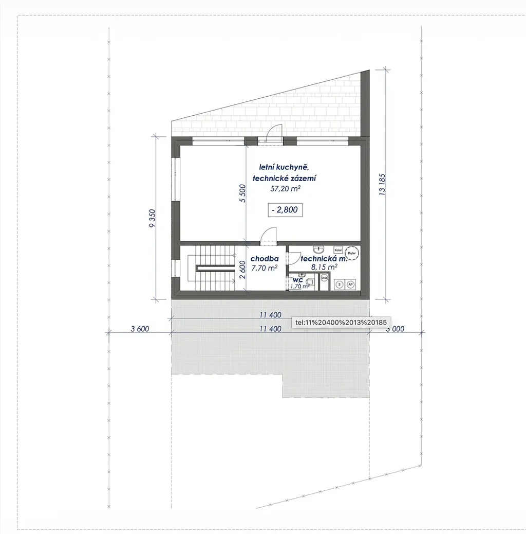 půdorys cca 11,4 × 18,8 m.