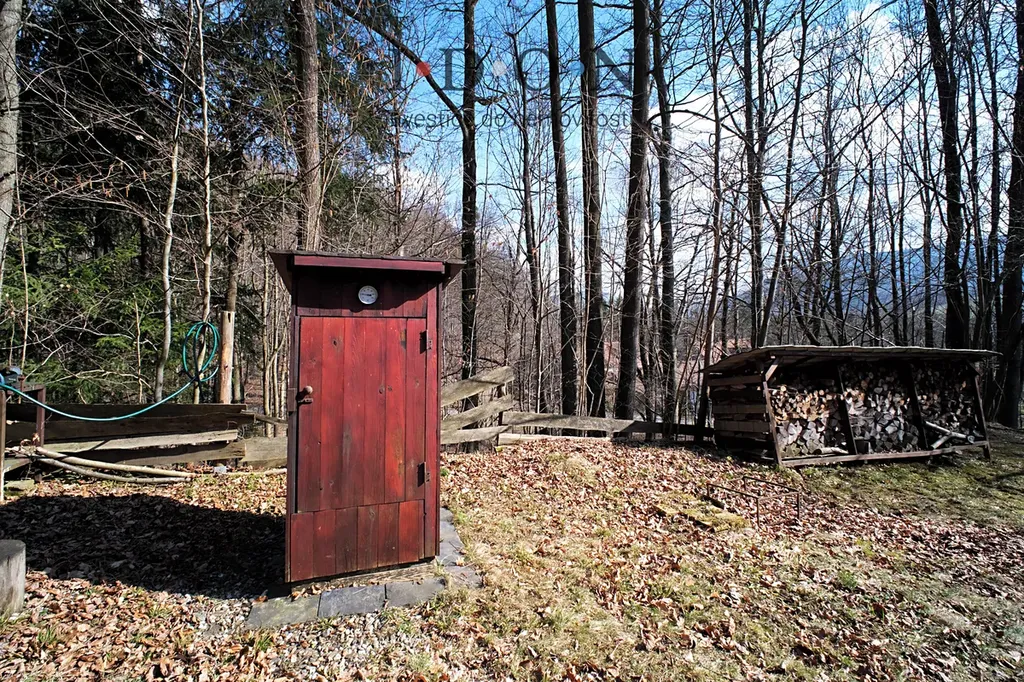 Součástí vybavení je splachovací toaleta a sprchový kout. Zdroj vody je řešen čerpáním z přírodního pramene potoka, což dodává nemovitosti na jedinečnosti. K dispozici je také menší, prakticky řešená kuchyňka, která umožňuje vaření na plynové bombě, jež je šikovně umístěna v zadní části chatky. Úložné prostory jsou zajištěny vestavnou skříní.