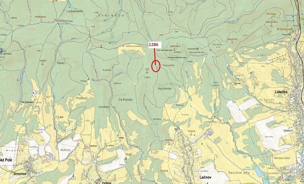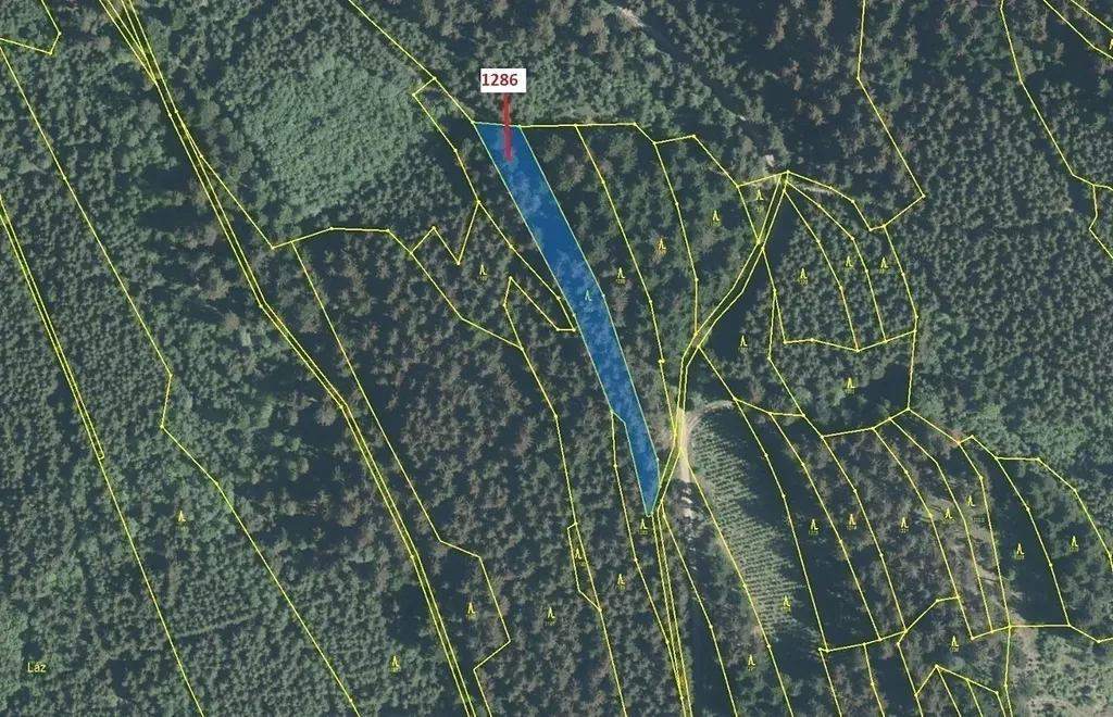 Lesní pozemek o výměře 2442 m2, parcelní číslo 1286, podíl 1/1, katastrální území Lačnov, obec Lačnov, obec s rozšířenou působností Vsetín, okres Vsetín, Zlínský kraj. Po těžbě.