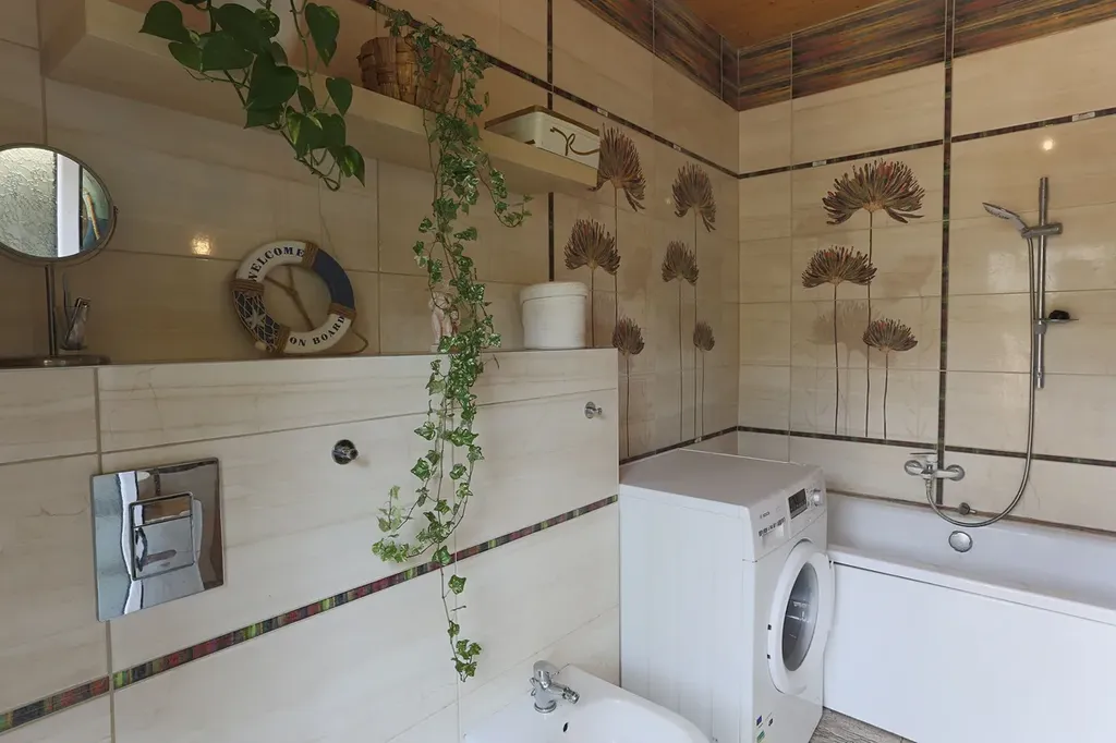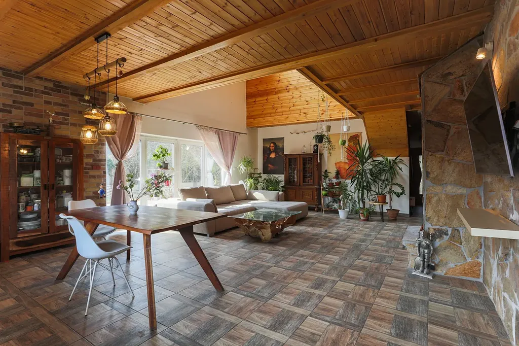 Dominantou domu je prostorný obývací pokoj s galerií a krbem, dvě plně vybavené kuchyně a 7 pokojů, což poskytuje dostatek prostoru pro velkou rodinu nebo vícegenerační bydlení. Součástí nemovitosti je samostatný zahradní domek se saunou a vlastní sprchou, ideální pro relaxaci a wellness.
