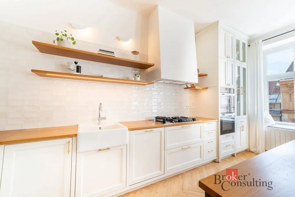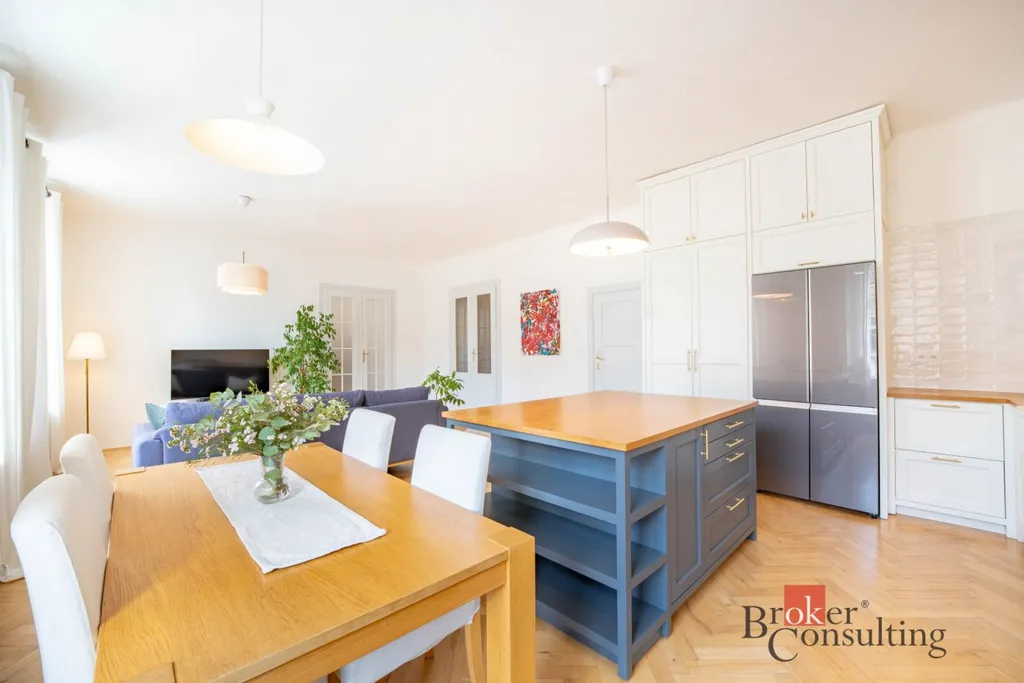 Celý byt se vyznačuje vysokými stropy a velkými okny ve všech místnostech, díky nimž je interiér přirozeně prosvětlený a působí velmi prostorně. Hlavní obytný prostor tvoří velkorysý obývací pokoj propojený s kuchyní vyrobenou na míru z masivu. Ta byla navržena s důrazem na detail i celkovou harmonii interiéru a je vybavena kvalitními značkovými spotřebiči Miele.