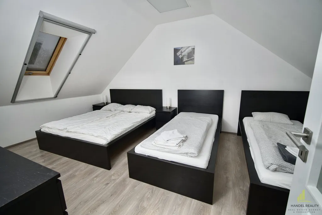 V podkroví je umístěna další spací část se dvěma samostatnými lůžky a jedním dvoulůžkem. Komfort v letních měsících zajišťuje klimatizace.