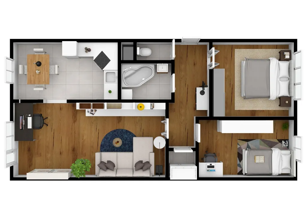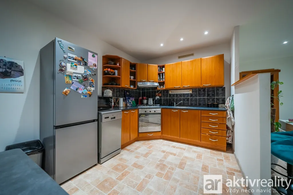 Po vchodu do bytu jsme v centrální předsíni, ze které se dostaneme do všech místností. Po pravé straně je samostatná toaleta, koupelna s rohovou vanou a přípojkou na pračku 40 cm. Po levé straně dětský pokojíček a ložnice. Dále projdeme do obývacího pokoje s francouzským oknem, kuchyňským koutem a jídelnou. Kuchyňská linka je vybavena el. troubou, plynovým sporákem, digestoří, myčkou Whirpool.