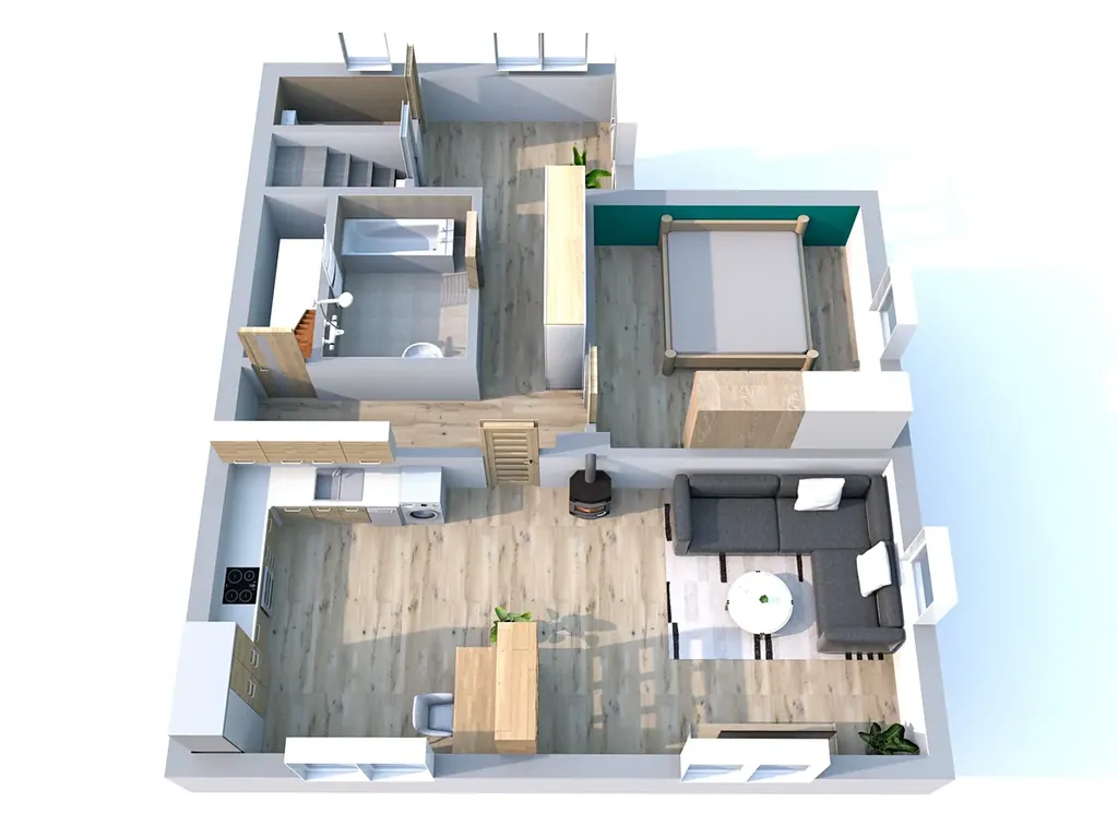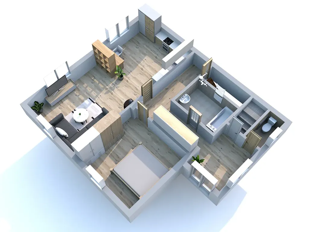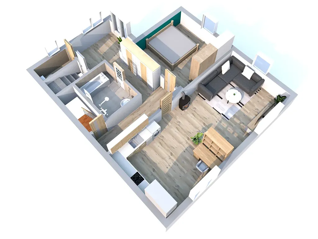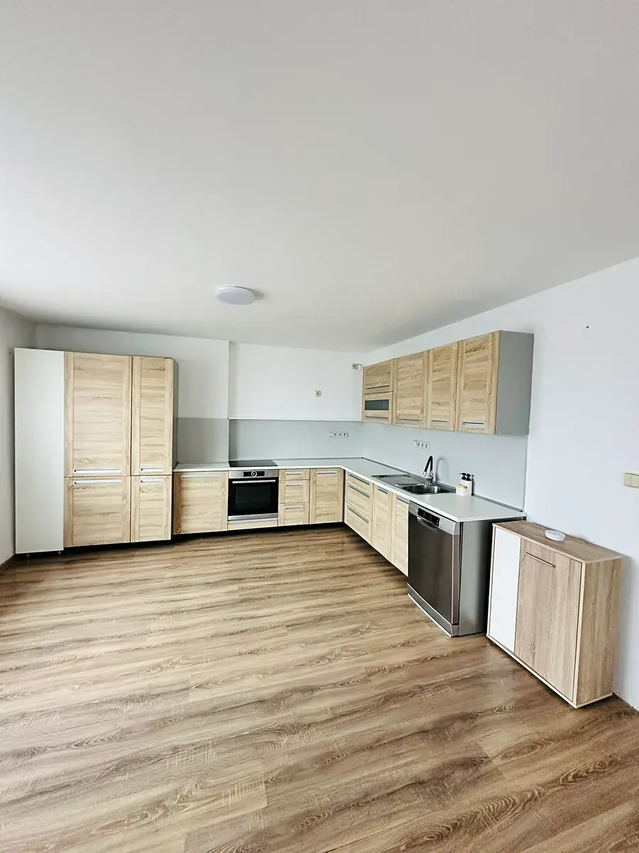 Dispozice 2kk má samostatnou ložnici a prostorný obývací pokoj s kuchyňským koutem, prostornou koupelnou s vanou a sprchovým koutem a samostatným WC.