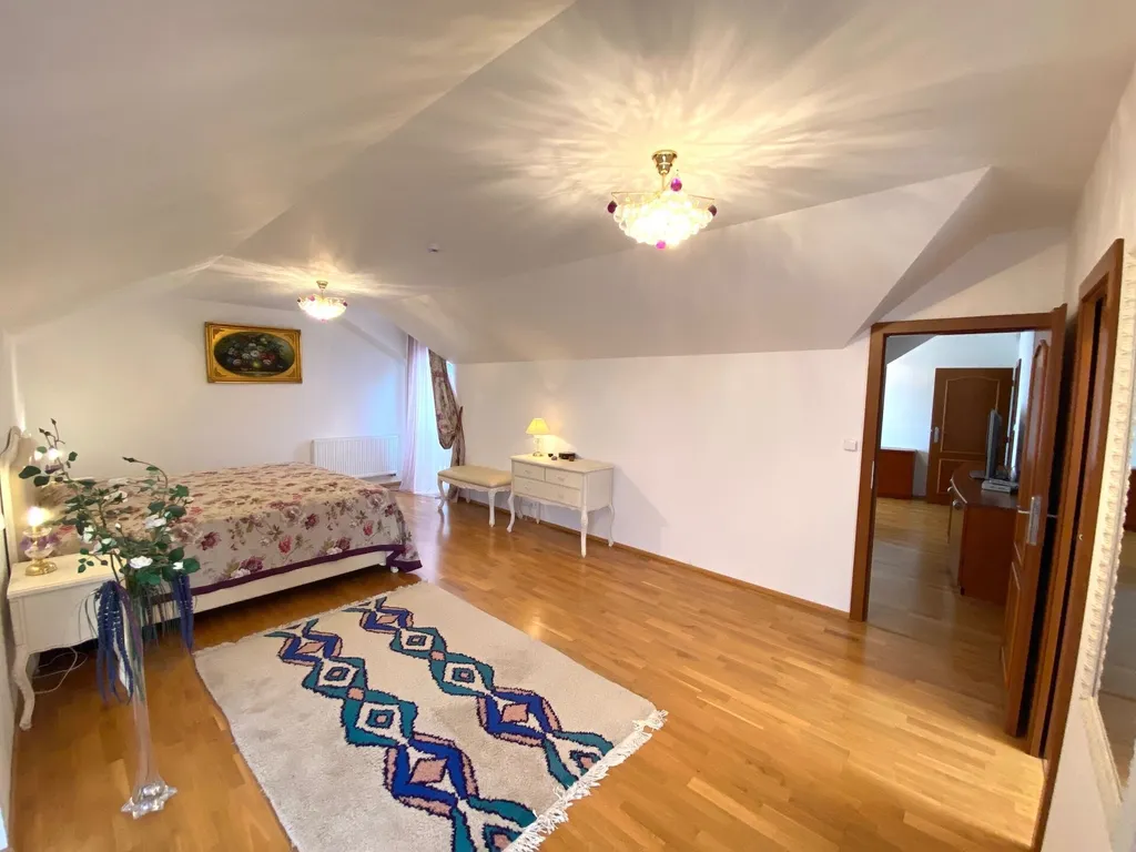 V patře domu najdete pět prostorných ložnic, které nabízejí dostatek místa pro děti, hosty nebo domácí pracovnu. O ranní shon se bát nemusíte – k dispozici jsou zde hned tři koupelny. Dva z pokojů mají navíc přístup na balkon, odkud je příjemný výhled do okolní zeleně a okolní zástavby moderních vil.