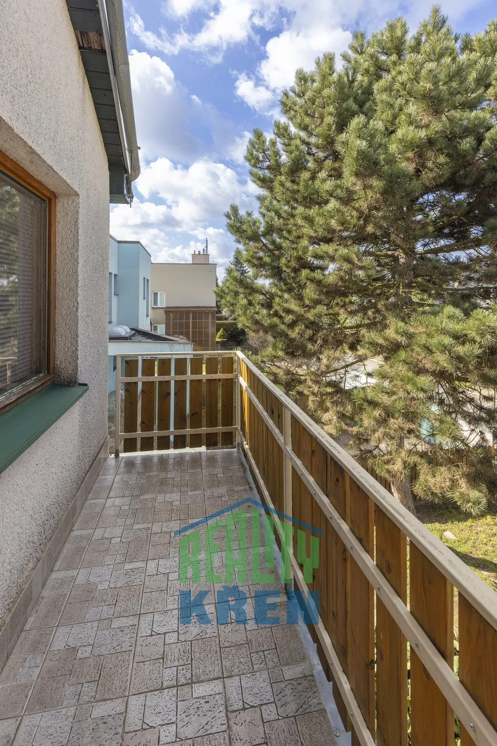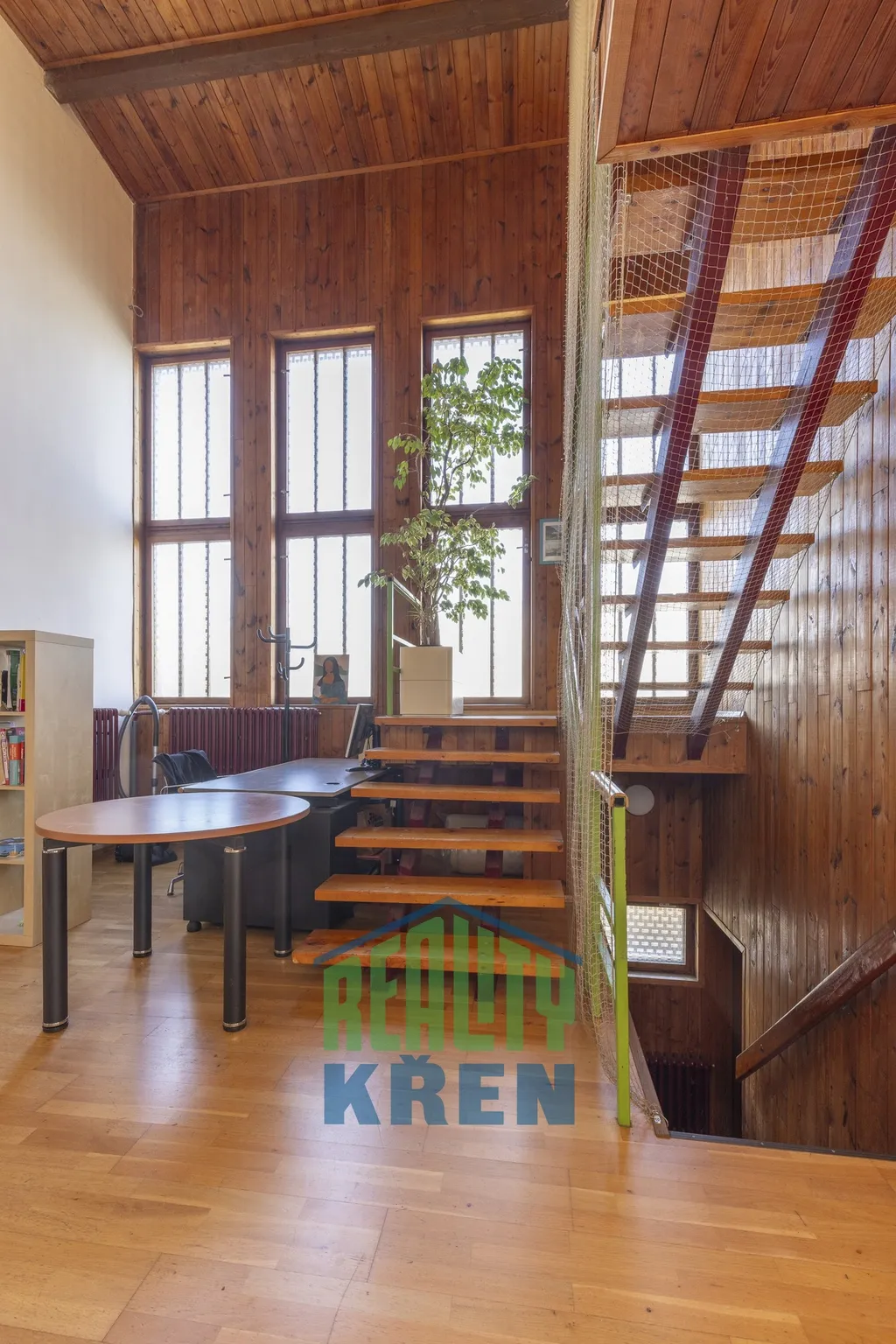 2. NP: otevřená galerie 8 m2, pět pokojů 16,7 m2, 10,8 m2, 11 m2, 8,6 m2, 16 m2, koupelna se sprchovým koutem a WC 2,5 m2, balkon 3,9 m2, terasa 7,8 m2 - z této terasy je výhled i na Pražský hrad;