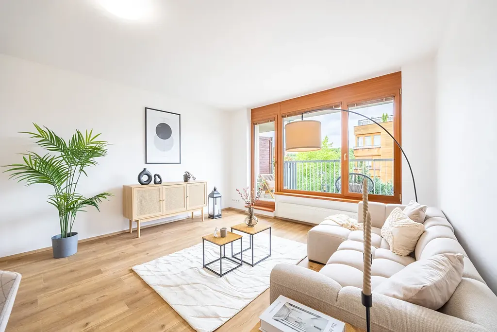Byt vypadá přesně jak vidíte na fotografiích, nejedná se o vizualizaci. Kuchyně je vyrobena na míru a kompletně vybavená spotřebiči (elektrická trouba, mikrovlnná trouba, indukční deska, myčka). Kuchyně je velkorysá s důrazem na dostatek úložných prostor a pohodlí při každodenním využívání. Velký obývací pokoj s kuchyní do L je dominantou tohoto bytu. Garážové stání se pak nachází jen pár kroků od výtahu.