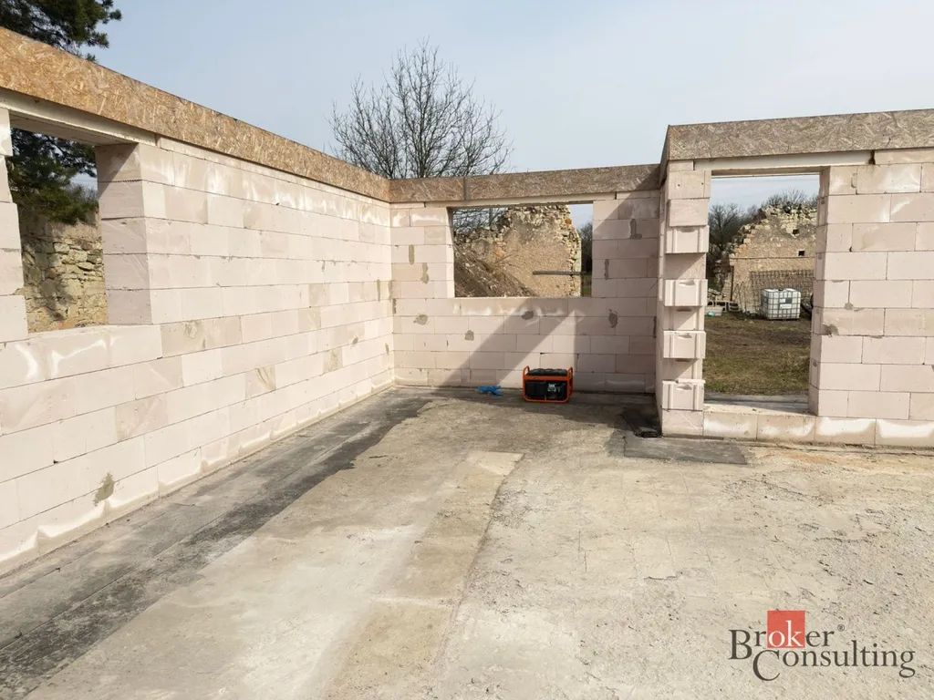 Nabízím k prodeji započatou hrubou stavbu rodinného domu, která je nyní v etapě, kdy jsou hotové obvodové i vnitřní nosné zdi a osazené překlady nad okny a dveřmi. Díky tomu je už jasně patrná budoucí podoba domu a nový majitel může plynule navázat další fází výstavby podle svých představ. Na stavbu je vydané platné stavební povolení a na pozemek jsou přivedeny veškeré potřebné inženýrské sítě – elektřina, voda i optický internet Grape.