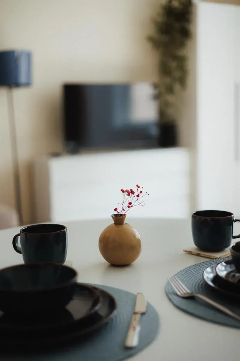 Dispozici tvoří otevřený obytný prostor s manželskou postelí, rozkládací pohovkou, moderní kuchyní s indukční varnou deskou, velkou lednicí s mrazákem, digestoří a jídelním stolem. V koupelně se nachází sprchový kout, toaleta, pračka a nové podlahové vytápění. Podlaha je laminátová, v koupelně italská dlažba. Vytápění je lokální elektrické, ohřev vody zajišťuje elektrický bojler. Byt působí vzdušně díky nadstandardní výšce stropů cca 3,4 m.