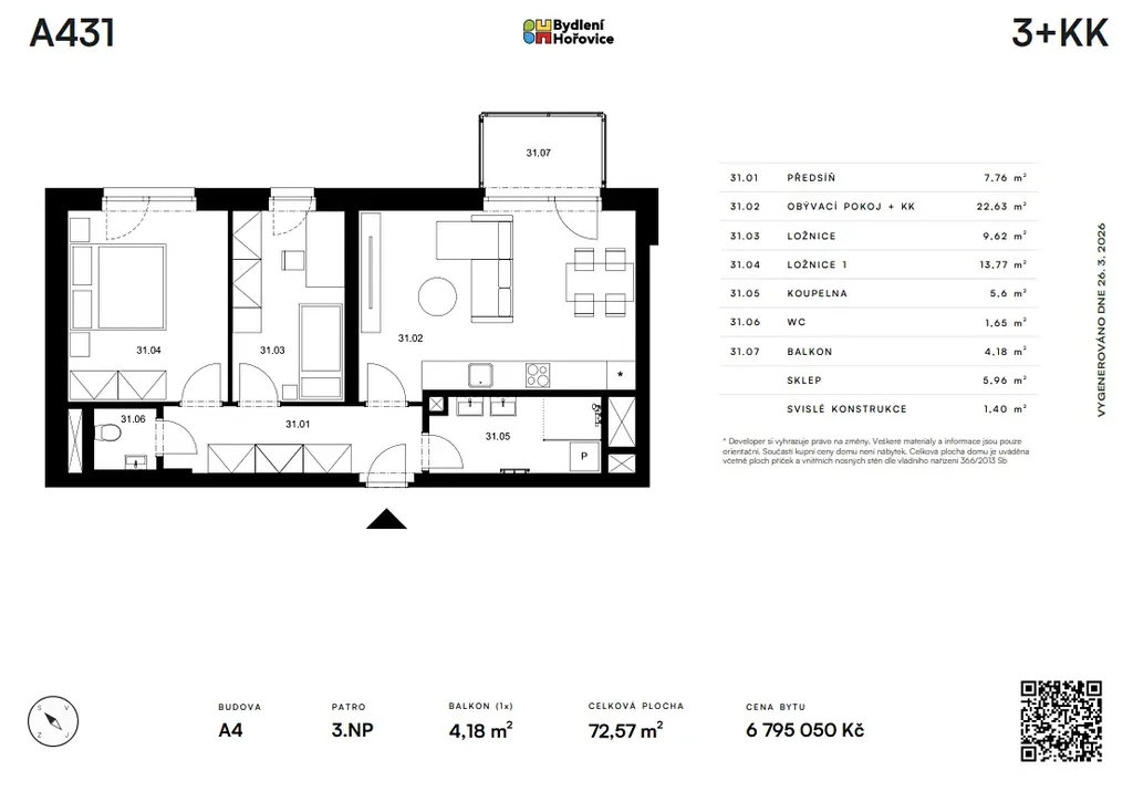 Nabízíme k prodeji byt 3+kk č. A431 o celkové ploše 72,57 m2 s balkonem a sklepem. Byt se nachází ve 3. nadzemním podlaží budovy A4 projektu Bydlení Hořovice. Plocha