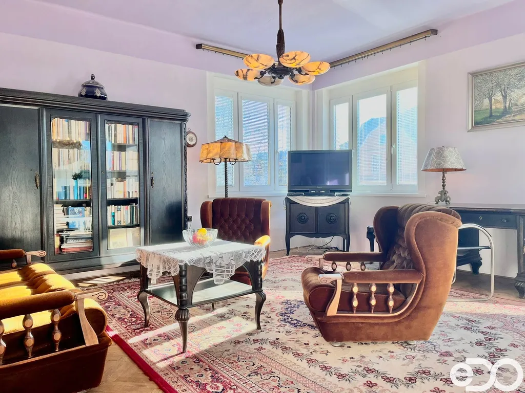 Byt zaujme především svou velkorysou dispozicí, množstvím světla a autentickým charakterem, který podtrhují rohově situovaná okna a původní prvky interiéru. Díky umístění ve vile je bydlení velmi klidné a zároveň reprezentativní.