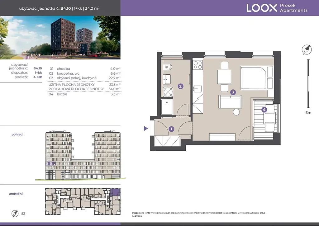 Nabízíme k pronájmu kompletně vybavený byt o dispozici 1+KK s výměrou 34 m² a lodžií 3,3 m² ve 4. NP v 11patrovém bytovém domě LOOX přímo u metra Prosek.