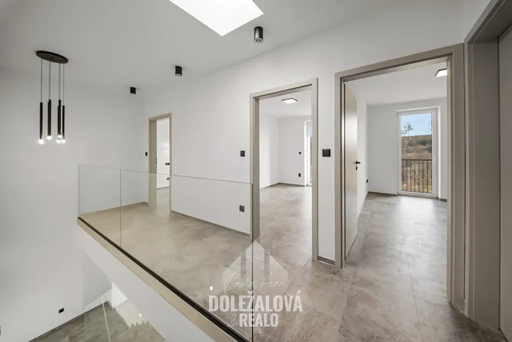 Dům je řešen jako dispozice 4+kk a nabízí praktické rozdělení prostoru na denní a klidovou zónu. V přízemí se nachází prostorný obývací pokoj propojený s kuchyní, odkud je přímý vstup na terasu a zahradu orientovanou na východ – ideální pro ranní kávu i klidné začátky dne. Dále zde najdete koupelnu a technické zázemí domu. V patře jsou tři samostatné pokoje a druhá koupelna, což poskytuje dostatek prostoru pro rodinu i práci z domova.