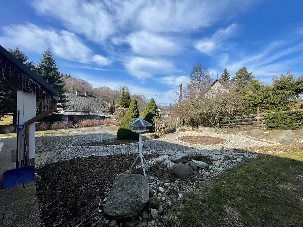 Součástí nabídky jsou rozsáhlé pozemky okolo domu, zahrady a louky s krásným výhledem na širé okolí.