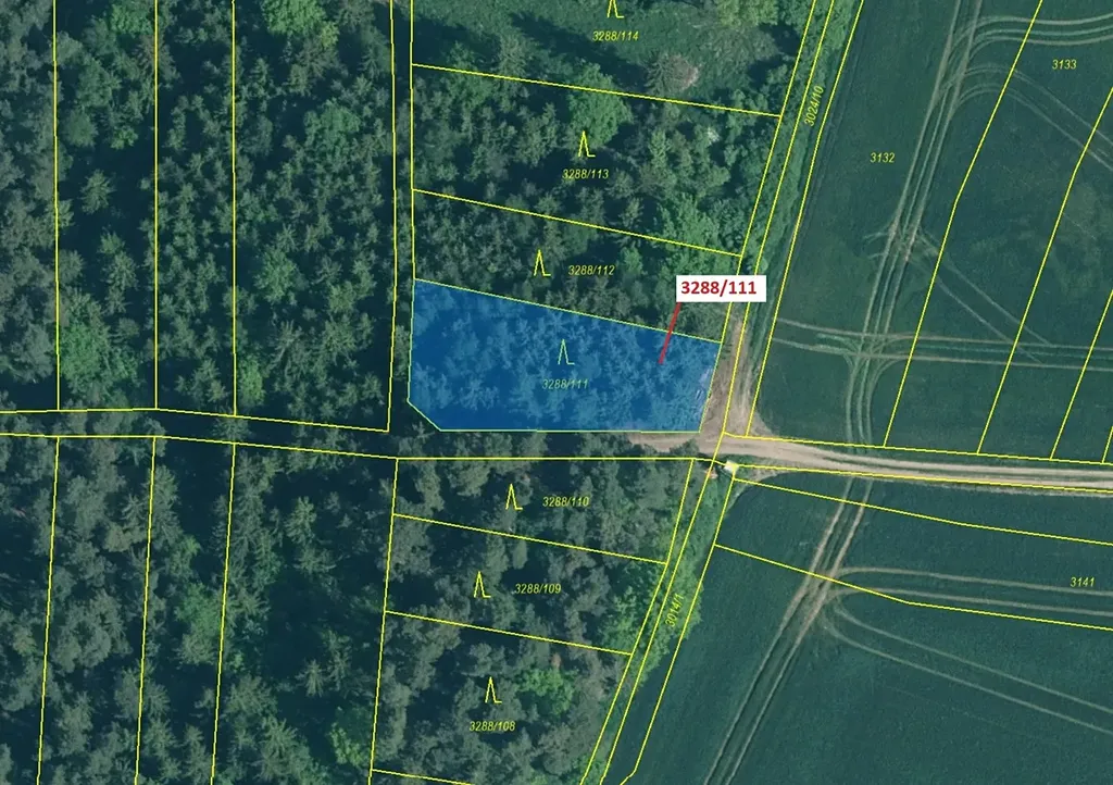 Lesní pozemek o výměře 978 m2, parcelní číslo 3288/111, podíl 1/1, katastrální území Hosty, obec Hosty, obec s rozšířenou působností Týn nad Vltavou, okres České Budějovice, Jihočeský kraj. Po těžbě.