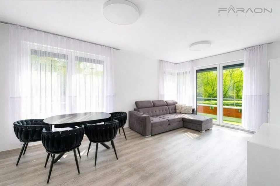 Dispozice bytu zahrnuje otevřený koncept obývacího pokoje s jídelní částí a přímým vstupem na terasu vhodnou pro letní posezení, kuchyňský kout s jídelním stolem, samostatnou ložnici, vstupní chodbu, prostornou koupelnu s vanou a závěsnou toaletou, sklep a parkovací místo v suterénu domu.